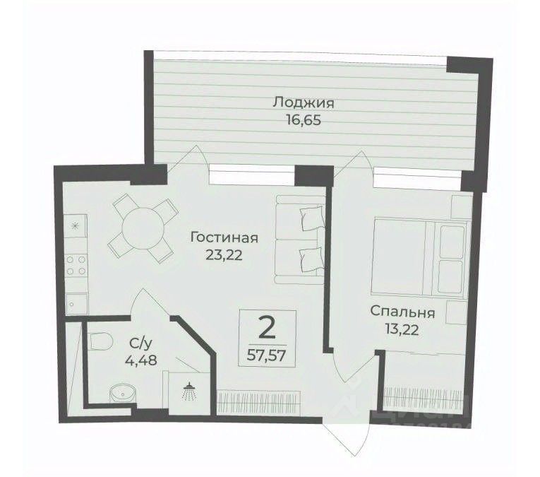 В строящемся апарт-комплексе TAMERUN продаются апартаменты, которые состоят из кухни-гостиной 23,2 кв.м, спальни 13,2 кв.м, санузла 4,5 кв.м и лоджия 16,7 кв.м. Общая площадь 57,6 кв.м.
