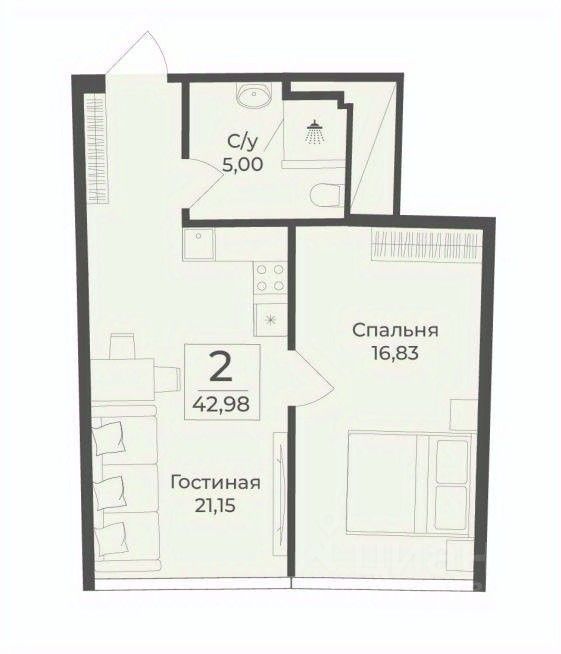 В строящемся апарт-комплексе TAMERUN продаются апартаменты, которые состоят из кухни-гостиной 21,2 м2, спальни 16,8 м2, санузла 5,0 м2. Общая площадь 43,0 м2.