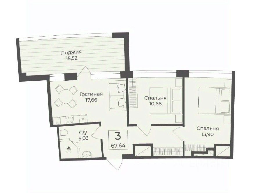 В строящемся апарт-комплексе TAMERUN продаются апартаменты, которые состоят из кухни-гостиной 17,6 м2, двух спален 13,9 и 10,7 м2, санузла 5,0 м2 и прихожей 4,9 м2 и лоджии. Общая площадь 67,6 м2.