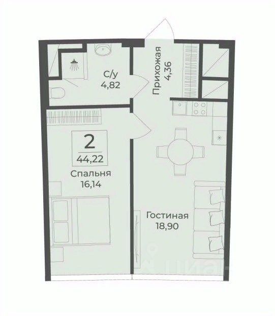 В строящемся апарт-комплексе TAMERUN продаются апартаменты, которые состоят из кухни-гостиной 18,9 м2, спальни 16,1 м2, санузла 4,8 м2 и прихожая 4,4 м2. Общая площадь 44,2 м2.