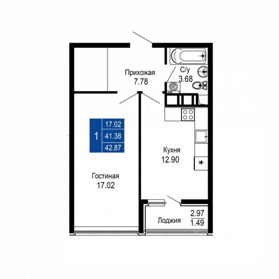 Общая площадь42,87 м2