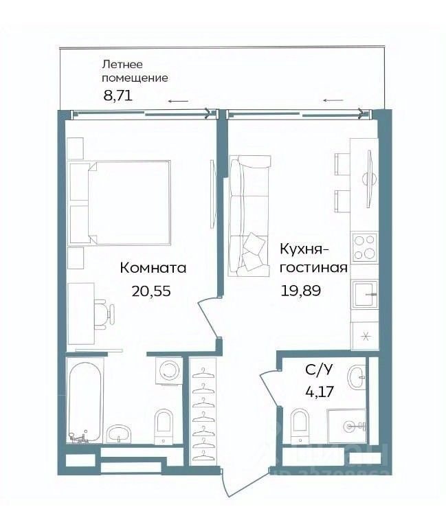 В строящемся кластере на первой береговой линии Tempo продаются отличные однокомнатные апартаменты с видом во двор, которые состоят из кухни-гостиной 19,9 м2, комнаты 15,5 м2, двух санузлов 5,0 и 4,2 м2, и балкона 8,7 м2. Общая площадь с балконом 53,3 м2.
