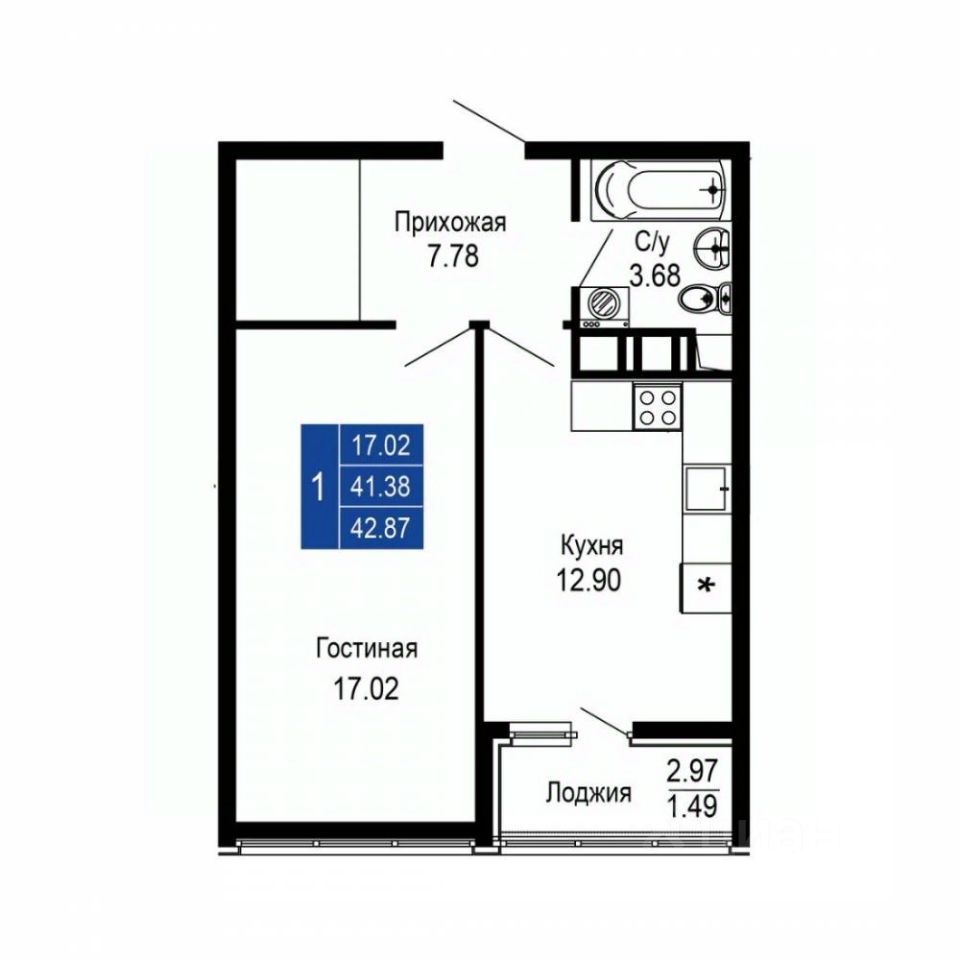 Общая площадь42,87 м2