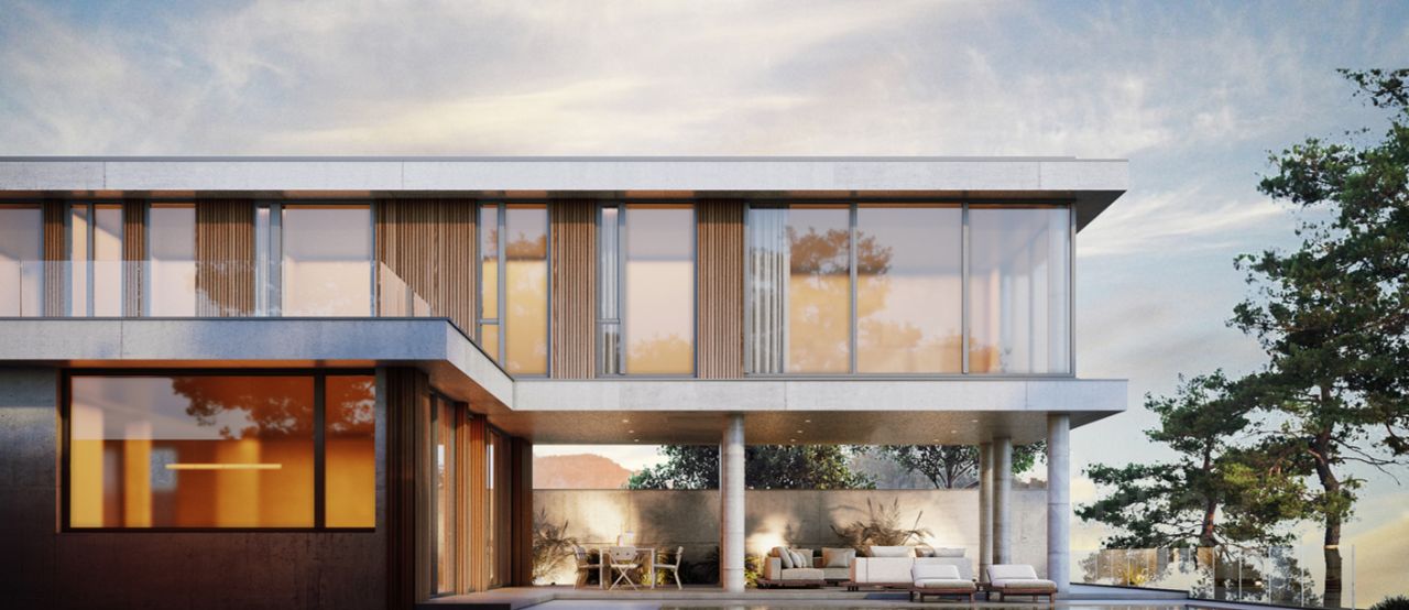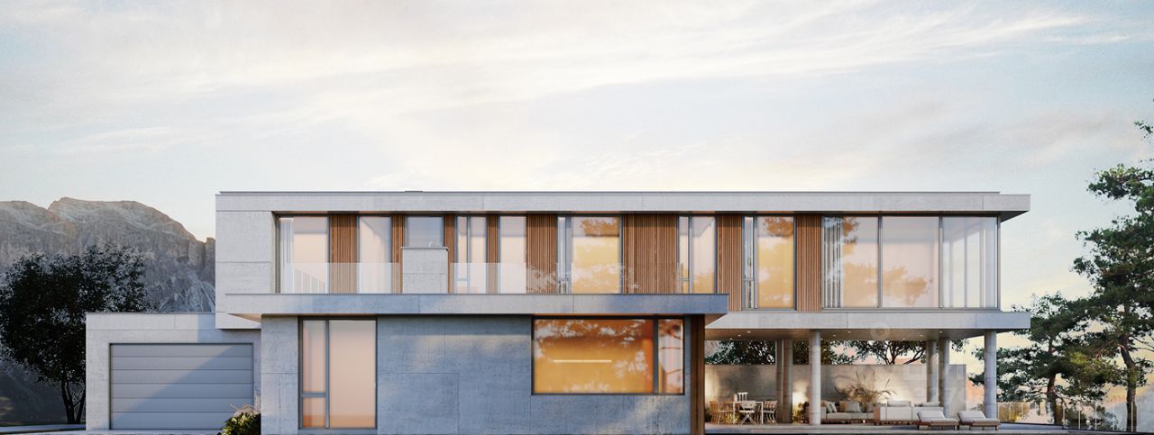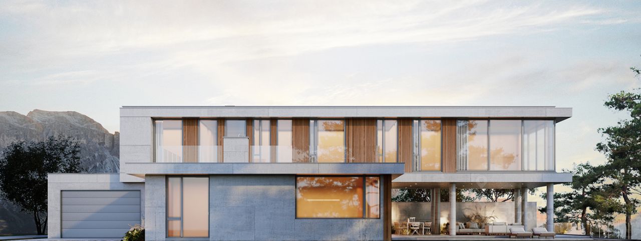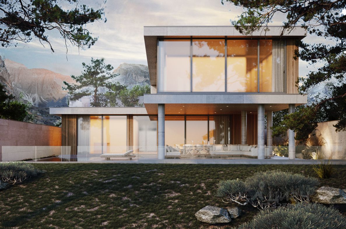 Сам дом полностью продумывался как для жизни, так и для комфортного отдыха всей семьей. Современные дизайнерские решения наполнили участок для лаконичного его использования. Каждый метр внутреннего пространства продуман с учетом всех ошибок, которые были учтены благодаря опыту прошлых проектов. Задумка: двухэтажный дом с гаражом, который развернут так, чтоб оставались виды из каждого окна и при этом не мешали друг другу. Первый этаж достаточно прост и понятен. Это гараж, технические помещения, гостевые санузлы, кухня гостиная и возможность расположить одну гостевую спальню. Второй же этаж, это полный полет фантазий, здесь спокойно можно разместятся 3 мастер спальни. Посадка на участке оставляет достаточно свободного места для сада, зоны барбекю, мест для загара или теневых зон и даже при желании бассейна.