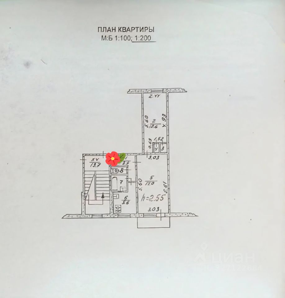 Общая площадь квартиры 43.5 кв.м. Квартира в жилом состоянии, под ремонт. Находится в середине дома. Комнаты смежные, площадью ( 17 кв.м.+12.6 кв.м). Кухня 5.6 кв.м., газ-счётчик, бойлер. Санузел раздельный, заменили стояк. Балкон застеклённый.