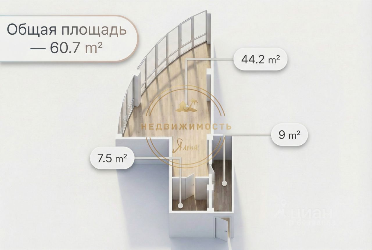 Планировка: Прихожая с местом под гардероб — 9 м² Просторный санузел — 7,5 м² Жилая зона с кухней — 44,2 м²