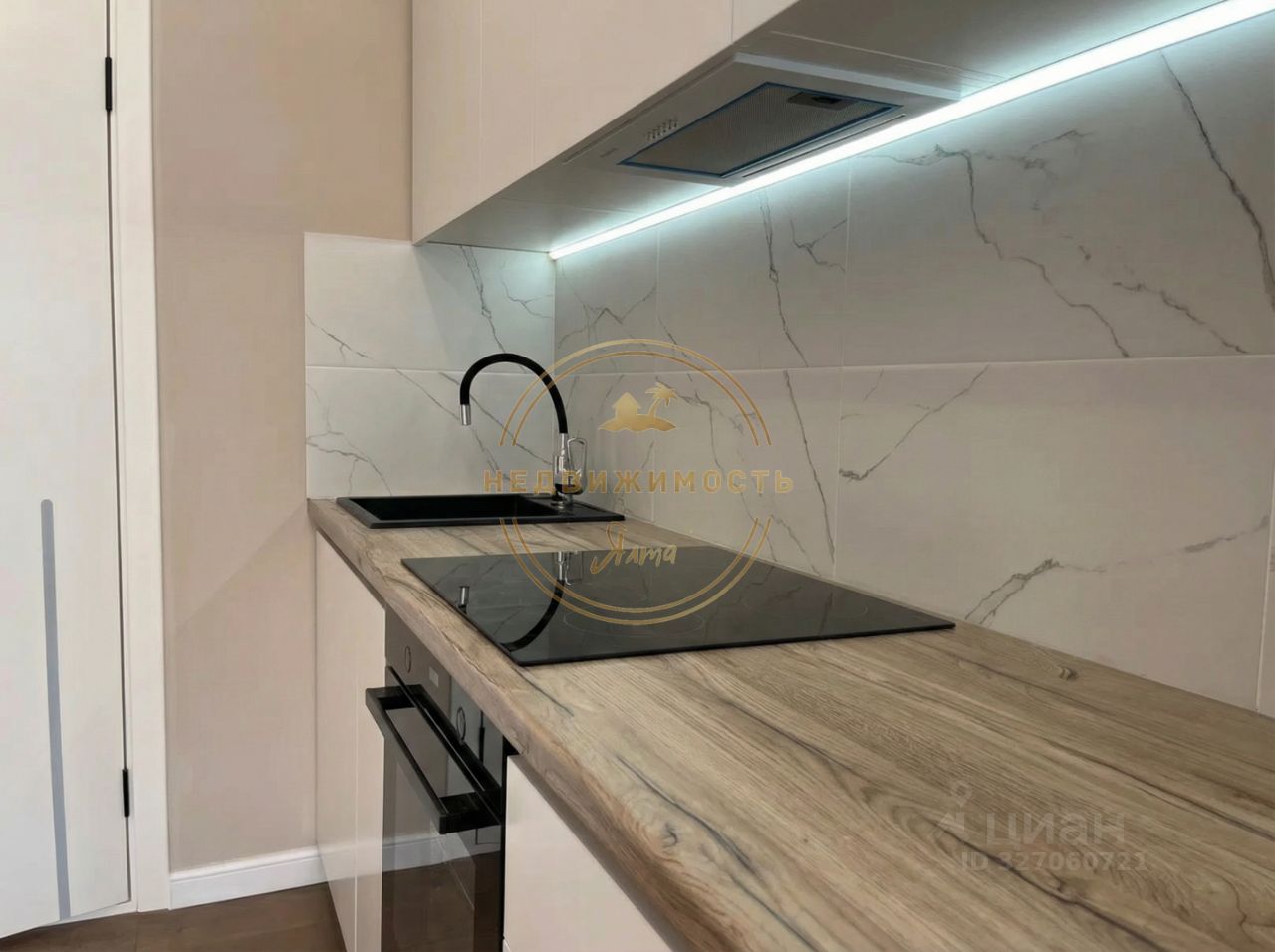 Кухонная зона укомплектована: Варочная поверхность Духовой шкаф Шкафы хранения Раковина Холодильник