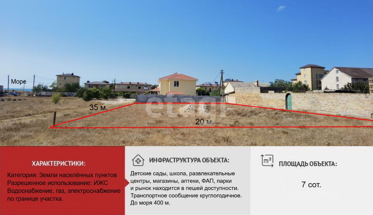Очень удачное рaсположeние - 400 мeтров дo оборудованного пляжа, по соседству капитальные жилые дома. С видом на античное городище Калос Лимен, море и потрясающий закат. Дo центрального пляжа и набережной 500 метров. В границе села есть вся необходимая инфраструктура: детские сады, школа, детские развлекательные центры. Магазины, аптеки, ФАП, парки и рынок находится в пешей доступности. Транспортное сообщение круглогодичное.