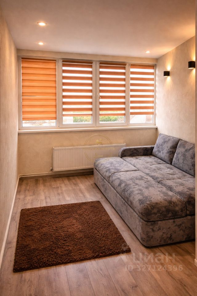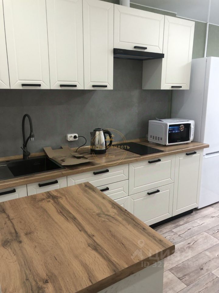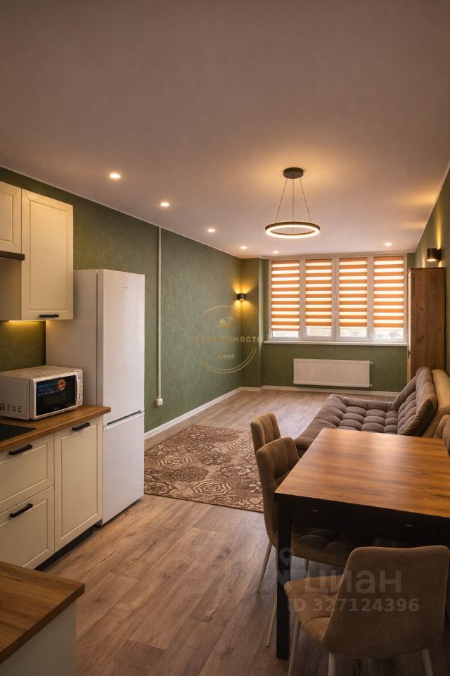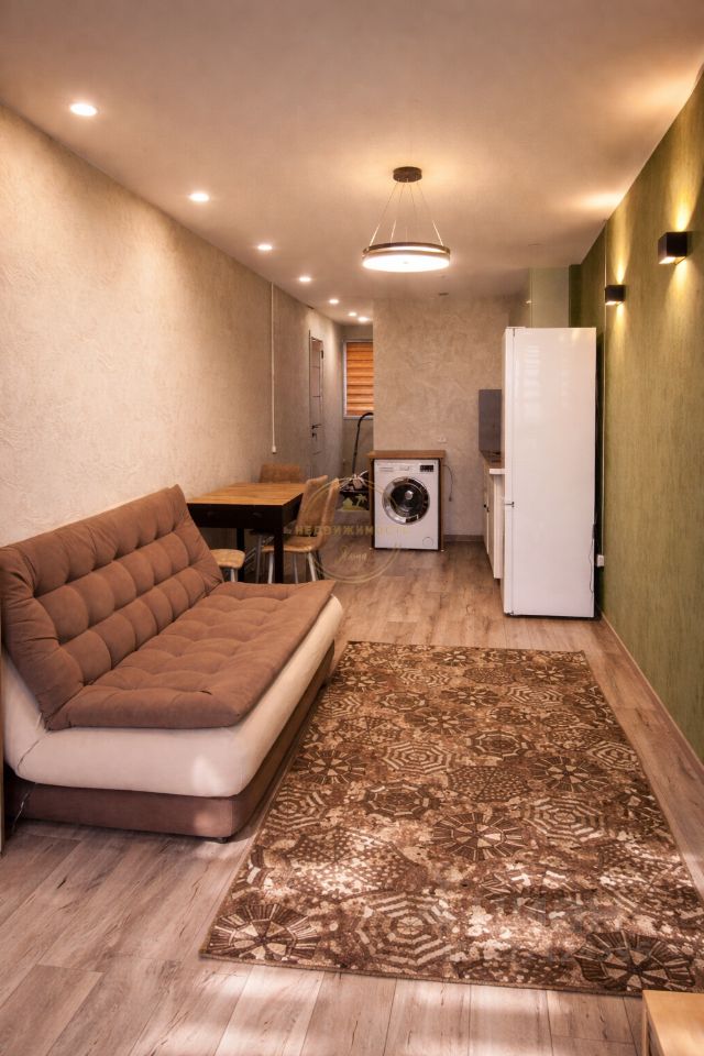 Кухня оборудована всей необходимой бытовой техникой, включая холодильник и микроволновую печь. В гостиной установлен удобный диван и шкафы для хранения вещей.