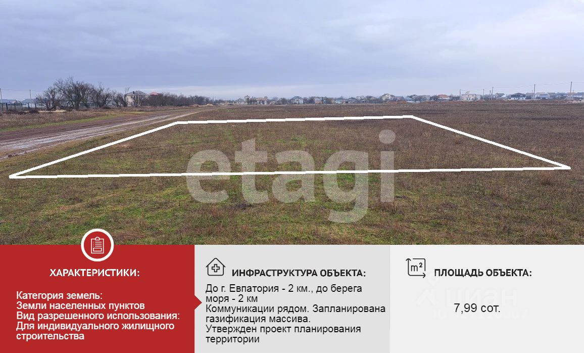 Преимущества и перспективы: - Имеется утвержденный проект планировки территории от администрации - Коммуникации проходят рядом, запланирована газификация массива - Соседние участки уже застраиваются — формируется респектабельное окружение - Район с высоким инвестиционным потенциалом и престижной локацией Инфраструктура для комфортной жизни развита: в шаговой доступности магазины, остановки, дорога на Евпаторию.
