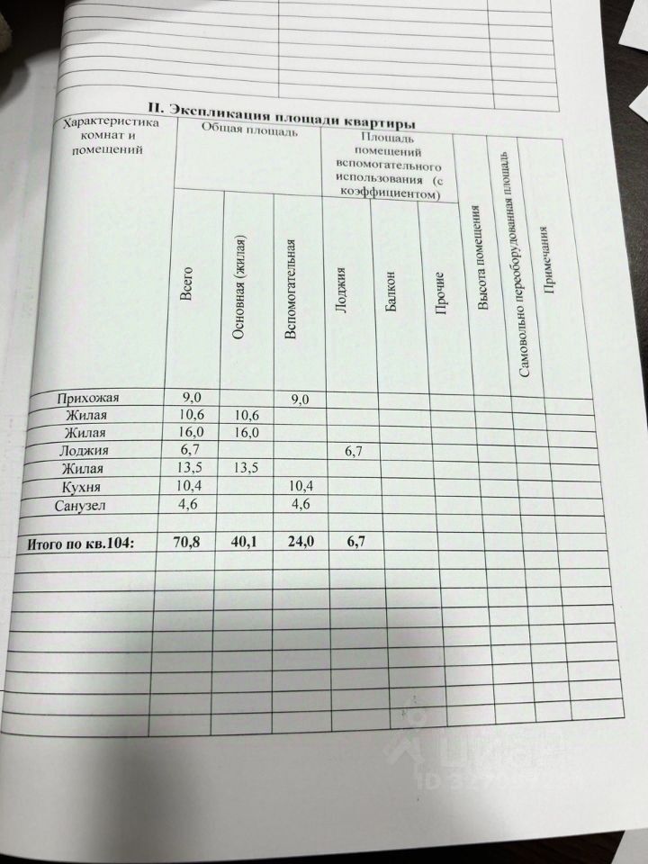 По документам в Росреестре — 64,1 м² (в техплане указана лоджия, которая фактически отсутствует, что видно на экспликации). Реальная площадь квартиры — 70,8 м²!