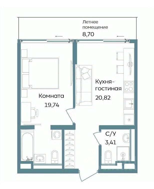 В строящемся кластере на первой береговой линии Tempo продаются отличные однокомнатные апартаменты с видом во двор, которые состоят из кухни-гостиной 20,8 м2, комнаты 14,7 м2, двух санузлов 5,0 и 3,4 м2, и балкона 8,7 м2. Общая площадь с балконом 52,6 м2.