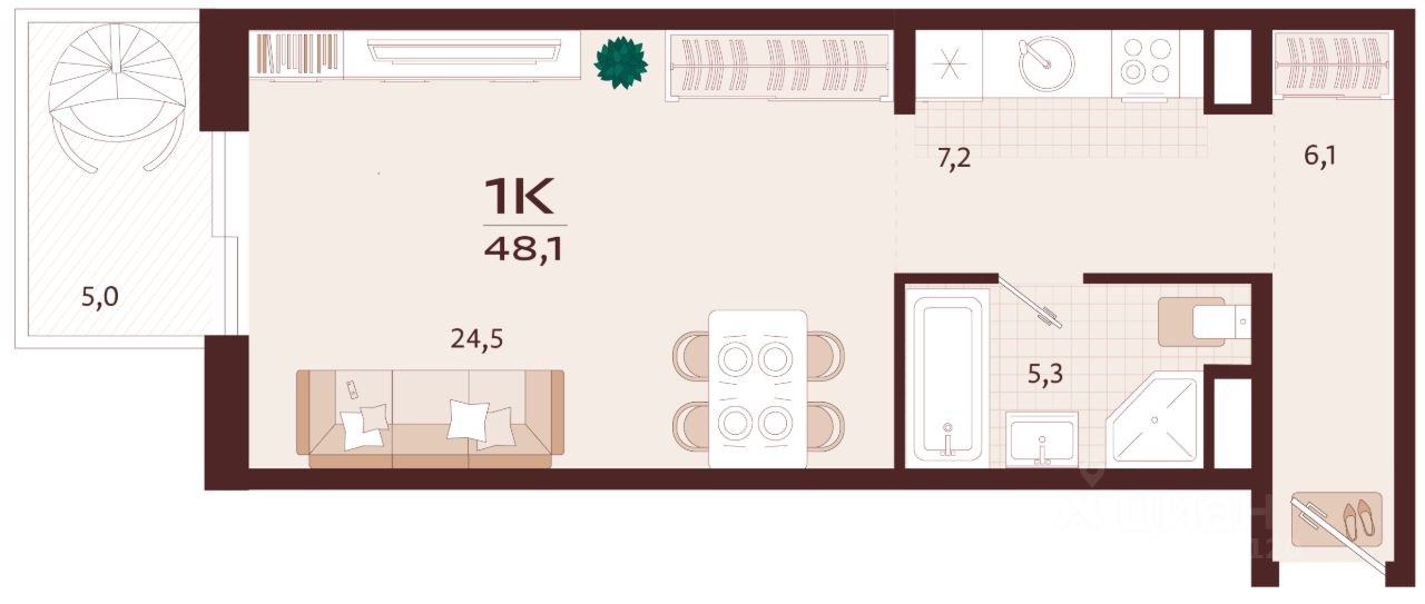 Продаётся 1-комнатная квартира в строящемся доме (Корпус 2), срок сдачи: II-кв. 2027, общей площадью 48.1 кв.м., на 5 этаже. Жилой комплекс бизнес-класса ''РОЯЛТА'' от застройщика ''ГК ТОЧНО'' в городе Ялта Республики Крым на улице Спендиарова.