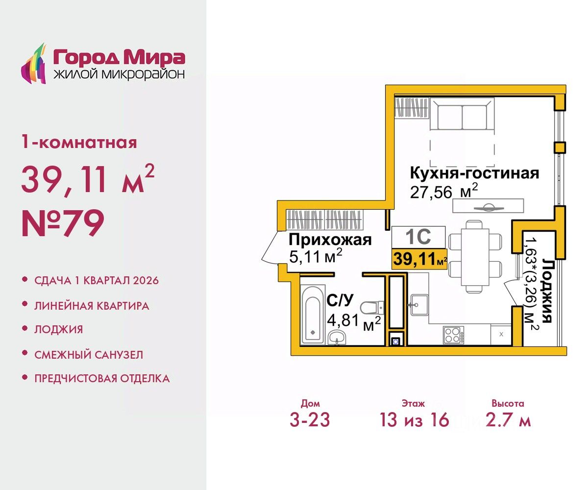 Продается 1-комн. квартира от застройщика с предчистовой отделкой в ЖМ ''Город Мира'' на 13 этаже. Общая площадь: 39.11 кв.м., жилая: 22.56 кв.м., площадь кухни: 5 кв.м. Все окна выходят на одну сторону. В квартире одна лоджия, один совмещенный санузел. Высота потолков 2.7 м.