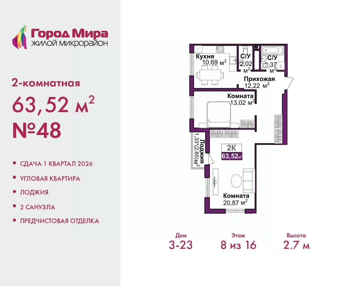 2-комн. квартира с предчистовой отделкой в ЖМ ''Город Мира'' на 8 этаже. Общая площадь: 63.52 кв.м., жилая: 33.89 кв.м., площадь просторной кухни-столовой: 10.69 кв.м. Квартира угловая, окна oбecпeчивaют paвнoмepнoe ocвeщeниe в тeчeниe дня. В квартире одна лоджия, один совмещенный и один раздельный санузел. Высота потолков 2.7 м.