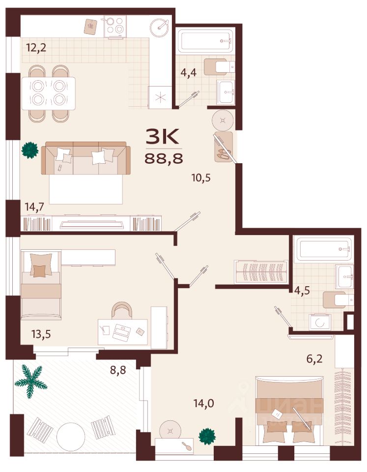 Продаётся 3-комнатная квартира в строящемся доме (Корпус 2), срок сдачи: II-кв. 2027, общей площадью 88.8 кв.м., на 1 этаже. Жилой комплекс бизнес-класса ''РОЯЛТА'' от застройщика ''ГК ТОЧНО'' в городе Ялта Республики Крым на улице Спендиарова.