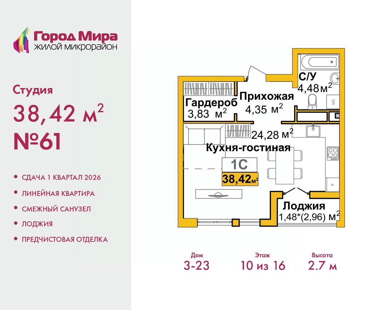 Просторная 1-комн. квартира-студия с предчистовой отделкой в ЖМ ''Город Мира'' на 10 этаже. Общая площадь: 38.42 кв.м., площадь гостиной 24.28 кв.м., из которых 5 кв.м. выделено под кухонную зону. Все окна выходят на одну сторону. В квартире одна лоджия, один совмещенный санузел. Высота потолков 2.7 м.