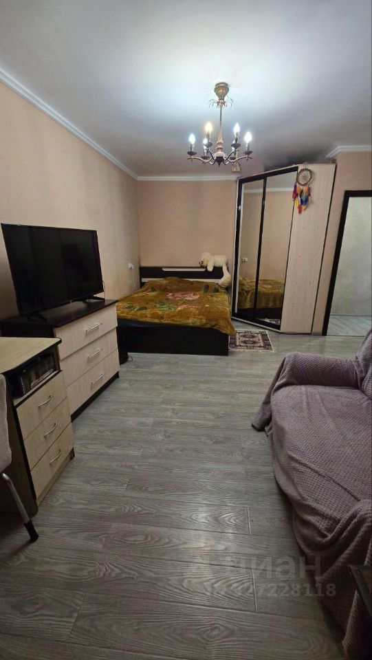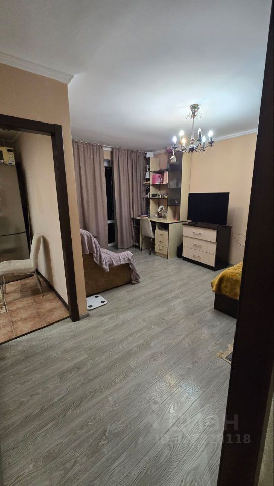 Планировка квартиры состоит из прихожей, кухни, комната, совмещенного санузла и балкона.