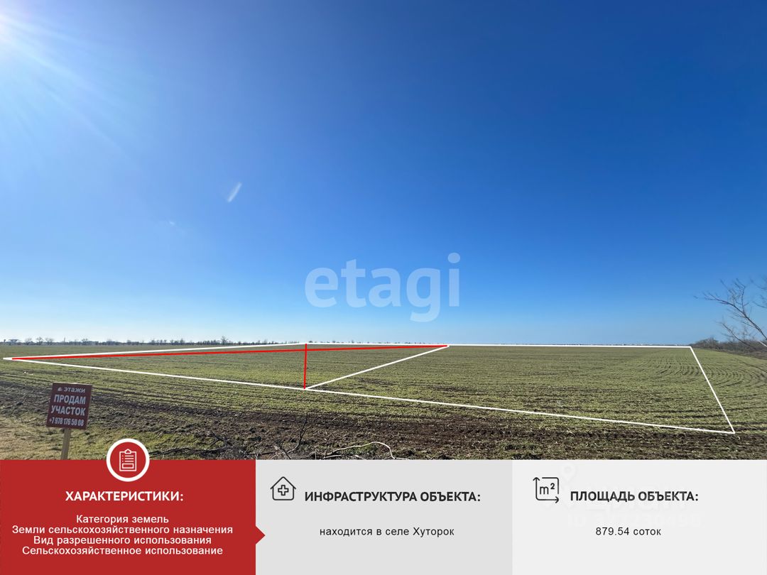 Продаётся земельный участок сельскохозяйственного назначения в селе Хуторок площадью 879,54 соток (около 8,8 га) в живописном уголке села Хуторок.