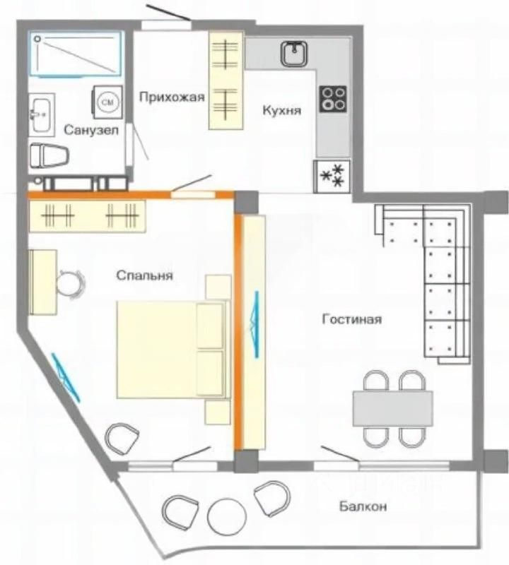 Кухню и гостиную можно объединить или разделить, оставив выход на балкон из гостиной.