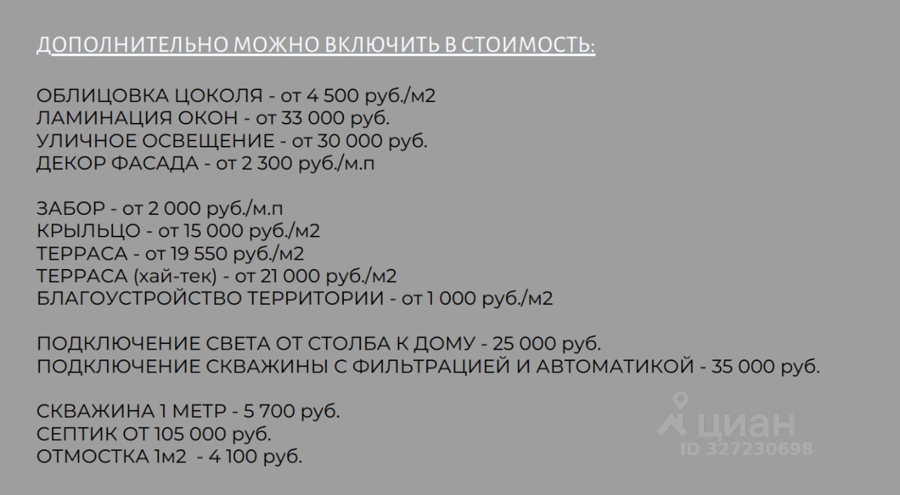 ДОПОЛНИТЕЛЬНО МОЖНО ВКЛЮЧИТЬ В СТОИМОСТЬ: ОБЛИЦОВКА ЦОКОЛЯ - от 4 500 руб./ м2 ЛАМИНАЦИЯ ОКОН от - 33 000 руб. УЛИЧНОЕ ОСВЕЩЕНИЕ - от 30 000 руб. ДЕКОР ФАСАДА - от 2 300 руб/м.п