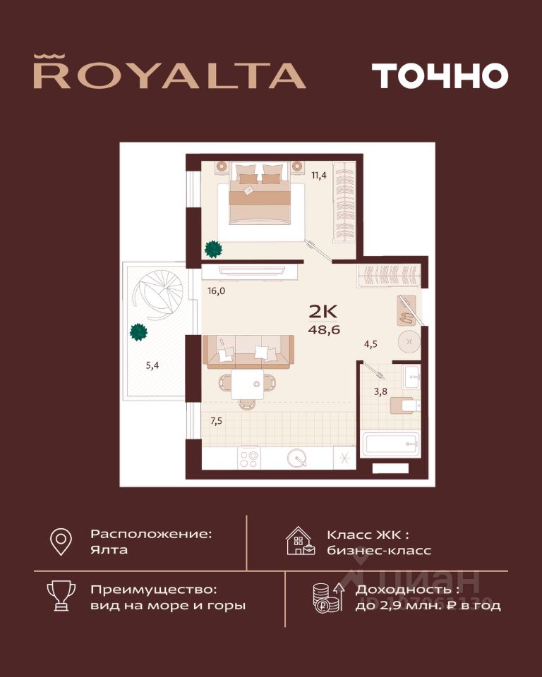 Жилой комплекс ''РОЯЛТА'' включает 5 монолитно-кирпичных девятиэтажных зданий. Проект предлагает квартиры различных планировок: от однокомнатных до трехкомнатных с расширенными балконами и террасами до 13,4 м2. Территория будет благоустроена детскими игровыми и спортивными площадками, гостевой автостоянкой и озеленением, включая газоны, деревья и кустарники. Также появятся современные уличные тренажёры, СПА-комплекс и панорамный инфинити-бассейн. В шаговой доступности находятся центральная набережная Ялты, детские сады, школы, супермаркеты, торговые центры, Ялтинский медицинский колледж, автовокзал и Мордвиновский парк.