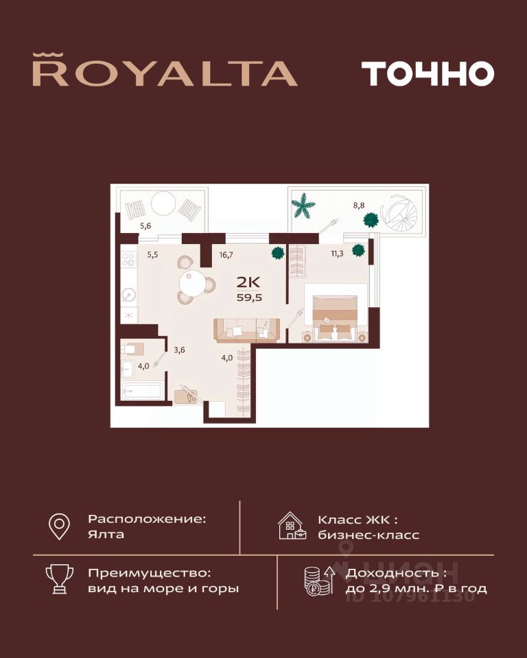 Жилой комплекс ''РОЯЛТА'' включает 5 монолитно-кирпичных девятиэтажных зданий. Проект предлагает квартиры различных планировок: от однокомнатных до трехкомнатных с расширенными балконами и террасами до 13,4 м2. Территория будет благоустроена детскими игровыми и спортивными площадками, гостевой автостоянкой и озеленением, включая газоны, деревья и кустарники. Также появятся современные уличные тренажёры, СПА-комплекс и панорамный инфинити-бассейн. В шаговой доступности находятся центральная набережная Ялты, детские сады, школы, супермаркеты, торговые центры, Ялтинский медицинский колледж, автовокзал и Мордвиновский парк.