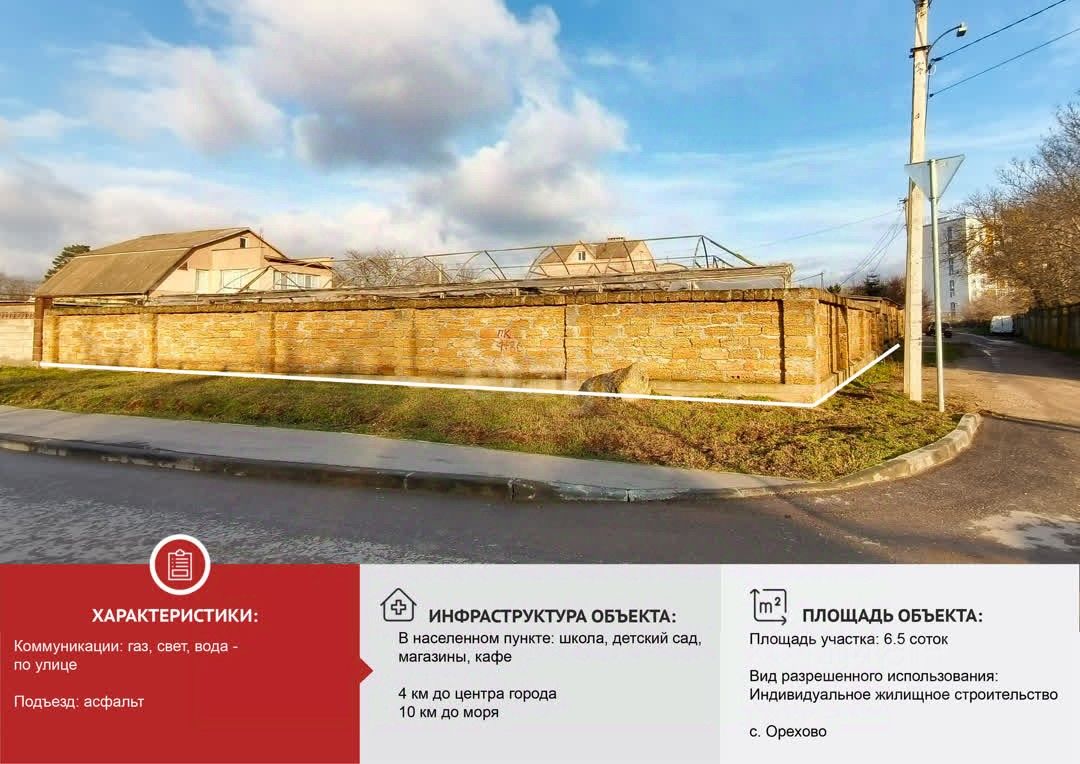 Продаётся земельный участок, расположенный в селе Орехово Сакского района. Участок площадью 6.5 соток с видом разрешенного использования: ИЖС, находится в сформированном и застроенном жилом массиве, что гарантирует развитую инфраструктуру и спокойную соседскую среду.
