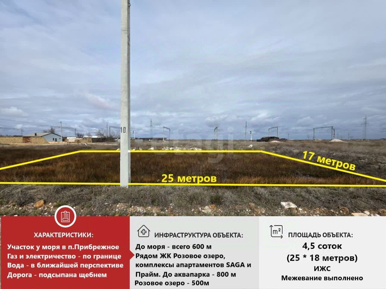 Участок располагается в уникальной локации: между морем и розовым озером! Рядом построена и сдана в эксплуатацию первая очередь ЖК Розовое озеро. На берегу моря строятся несколько комплексов: Saga, Прайм, скоро начнется грандиозное строительство по федеральному проекту ''Золотые пески России'', которые привлекут большой поток туристов и повысит качество инфраструктуры.