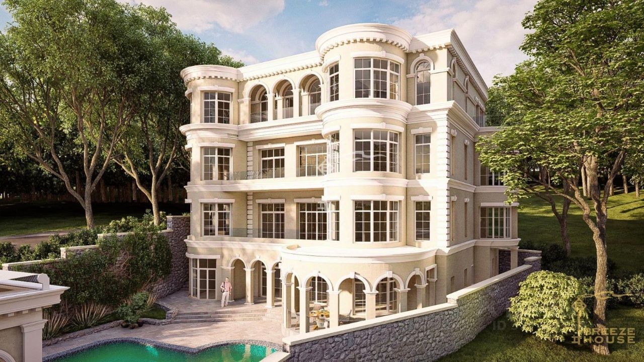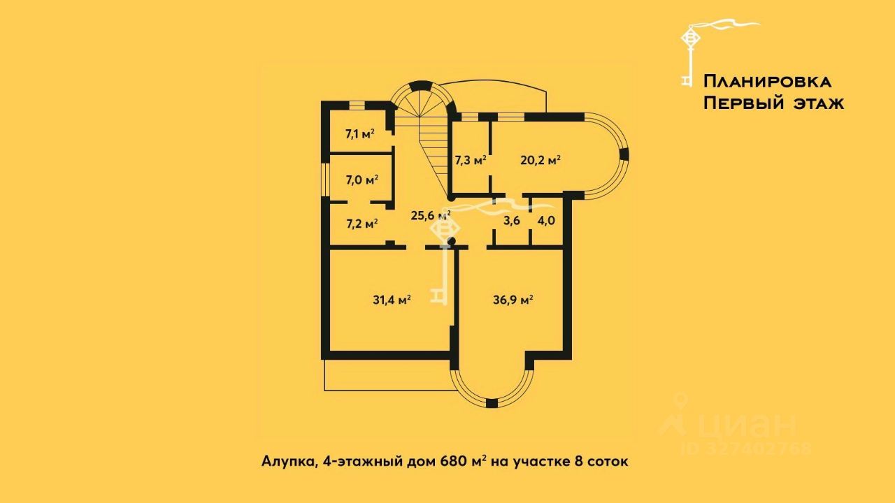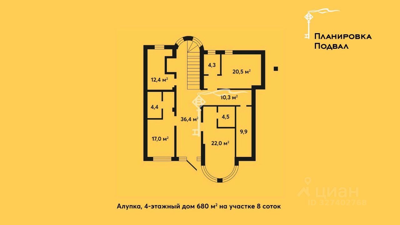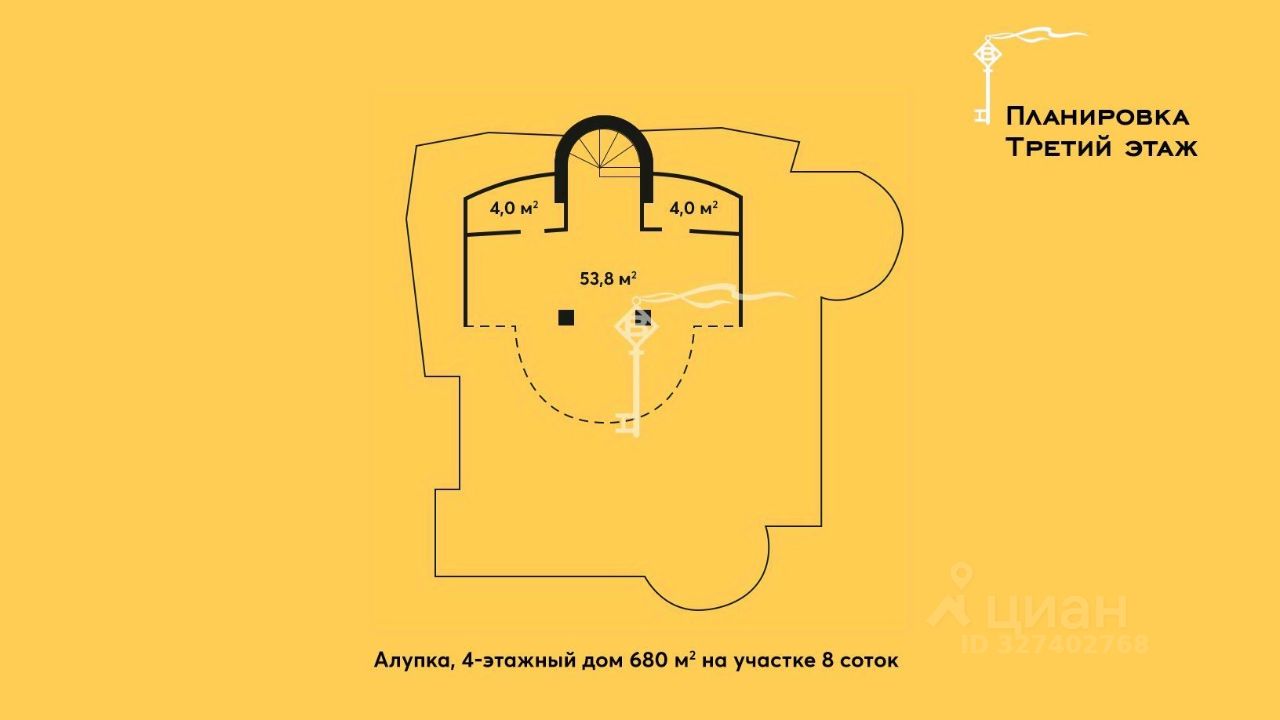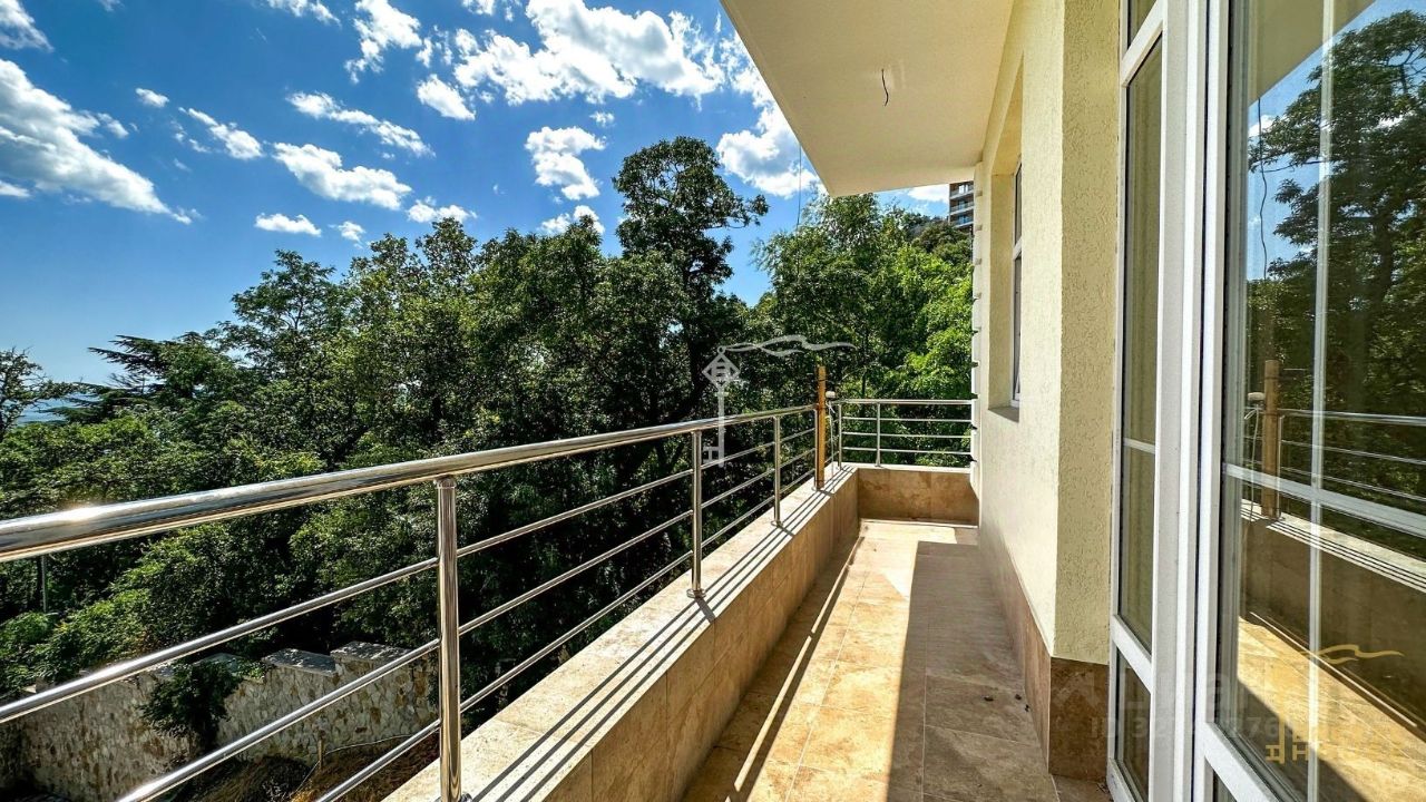 Четырёхэтажная резиденция общей площадью 680 м² расположена на участке 8 соток ИЖС в прибрежной части Алупки, всего в 50 метрах от моря с шикарными видами на Чёрное море и силуэт горы Ай-Петри.