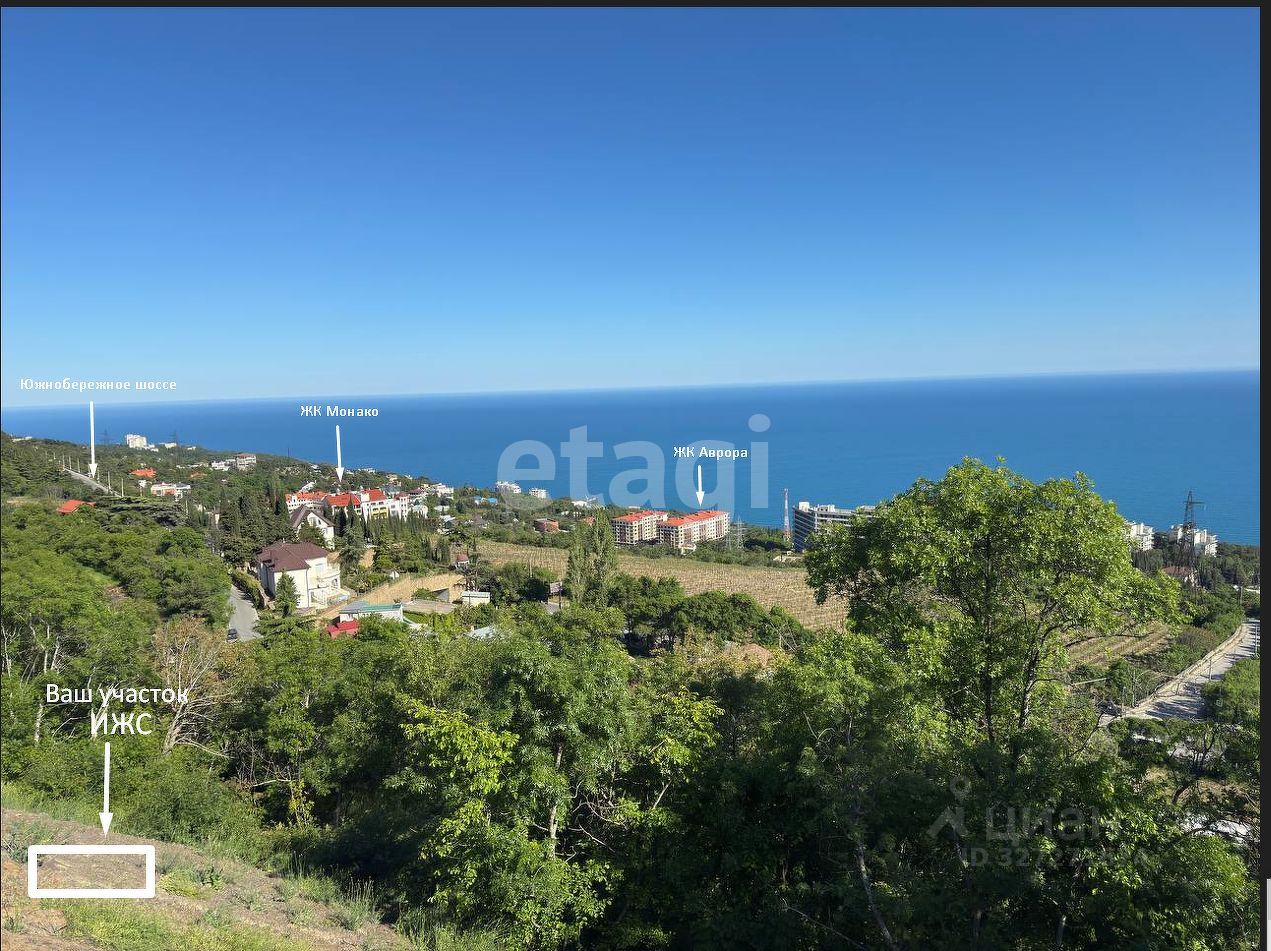 Продается участок площадью 10 соток предназначен для индивидуального жилищного строительства и расположен в живописной части поселка Восход, выше Южнобережного шоссе. Благодаря своему расположению на склоне с уклоном более 45 градусов участок предлагает уникальные панорамные виды на море, горы, Ласточкино гнездо и застройку Нижнего Восхода. Многоугольная форма с прямыми углами позволяет гибко подойти к проектированию будущего дома, а окружающие вечнозеленые деревья создают ощущение уединенности и естественного ландшафта. Центральные коммуникации проходят в 200 метрах от границ, что упрощает подключение к инженерным сетям. Подъезд к участку осуществляется по грунтовым дорогам, пролегающим вдоль виноградников, что добавляет местному колориту.