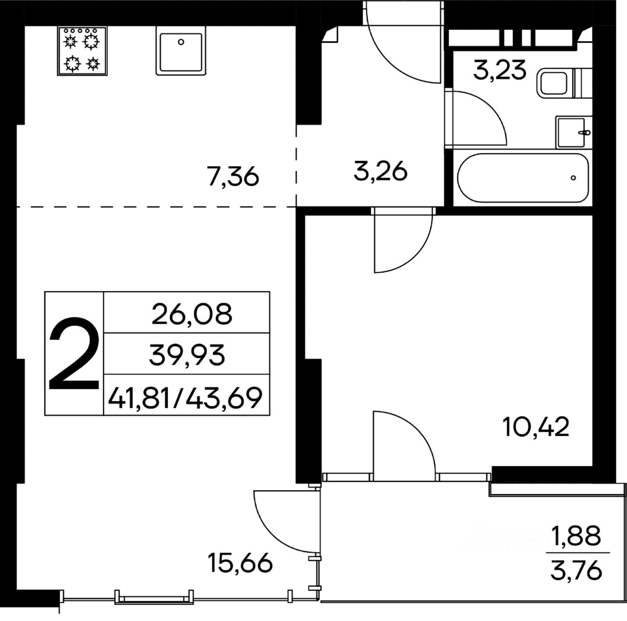 Общая площадь43,69 м2
