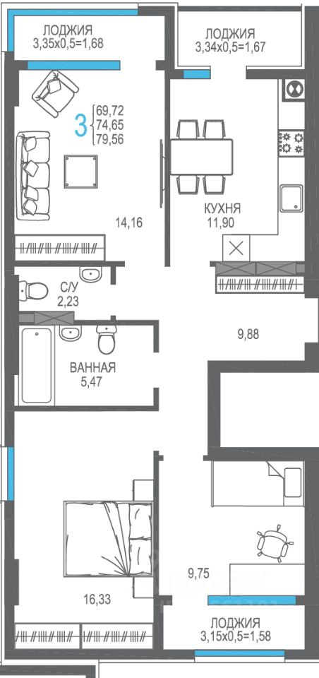 Продаётся 3-комнатная квартира в строящемся доме (Корпус 3), срок сдачи: I-кв. 2026, общей площадью 74.65 кв.м., на 2 этаже. Жилой комплекс ''На Фонтанке'' в городе Алушта на улице Багликова.