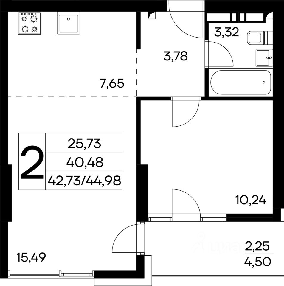 Общая площадь44,98 м2