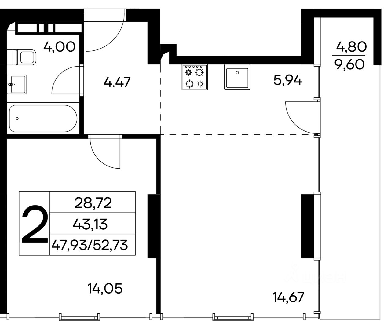 Общая площадь52,73 м2