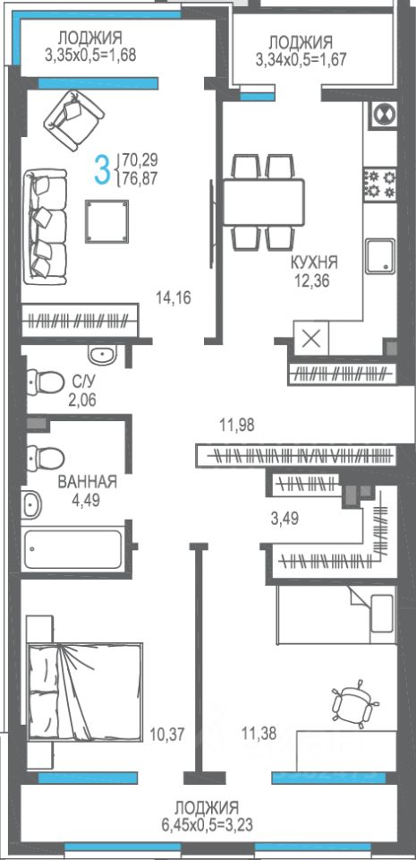 Общая площадь76,87 м2