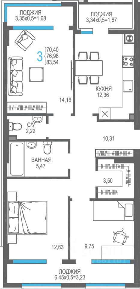 Общая площадь76,98 м2