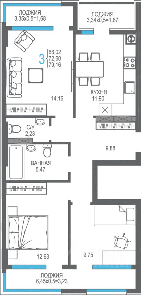 продам 3-к, Багликова, 27/418 919 240 ₽